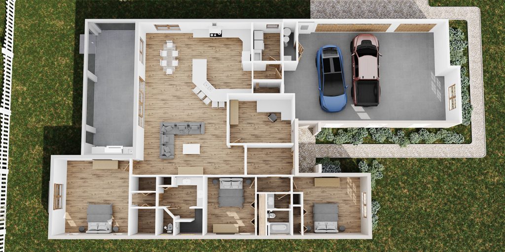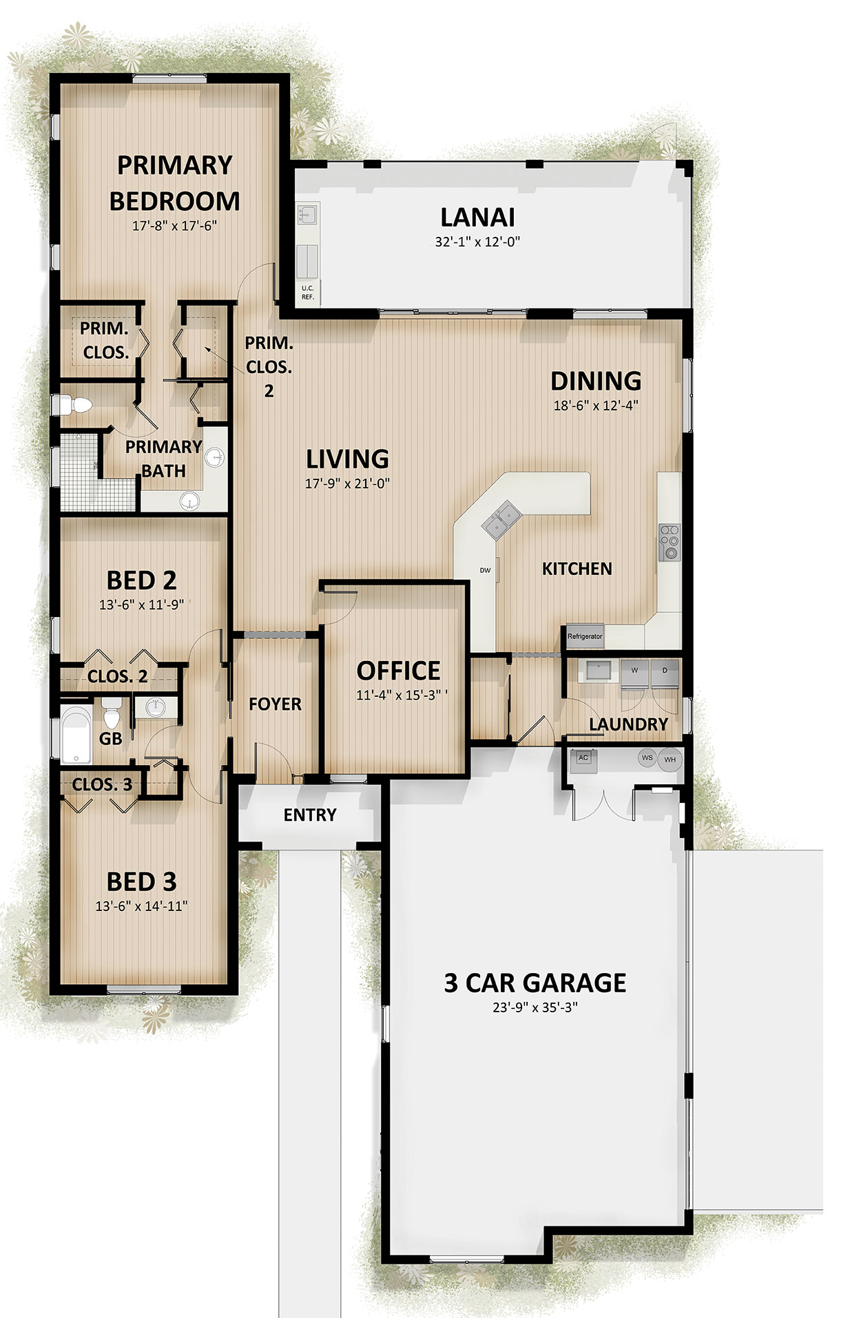 Custom closets with built-in shelving and 7 ¼” deluxe baseboards add an elevated finishing touch. A three-car garage with insulated doors and Shark Coatings™ floors ensures prolonged style.