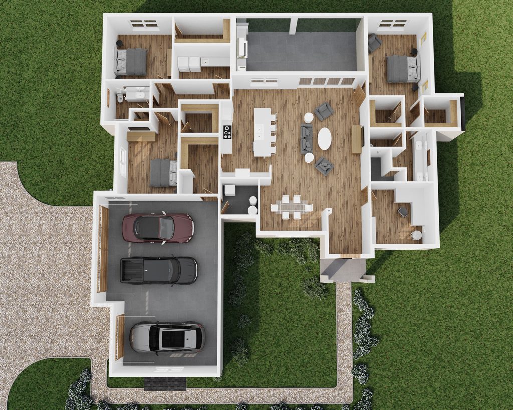 Custom closets with built-in shelving and 7 ¼” deluxe baseboards add an elevated finishing touch. A three-car garage with insulated doors and Shark Coatings™ floors ensures prolonged style.