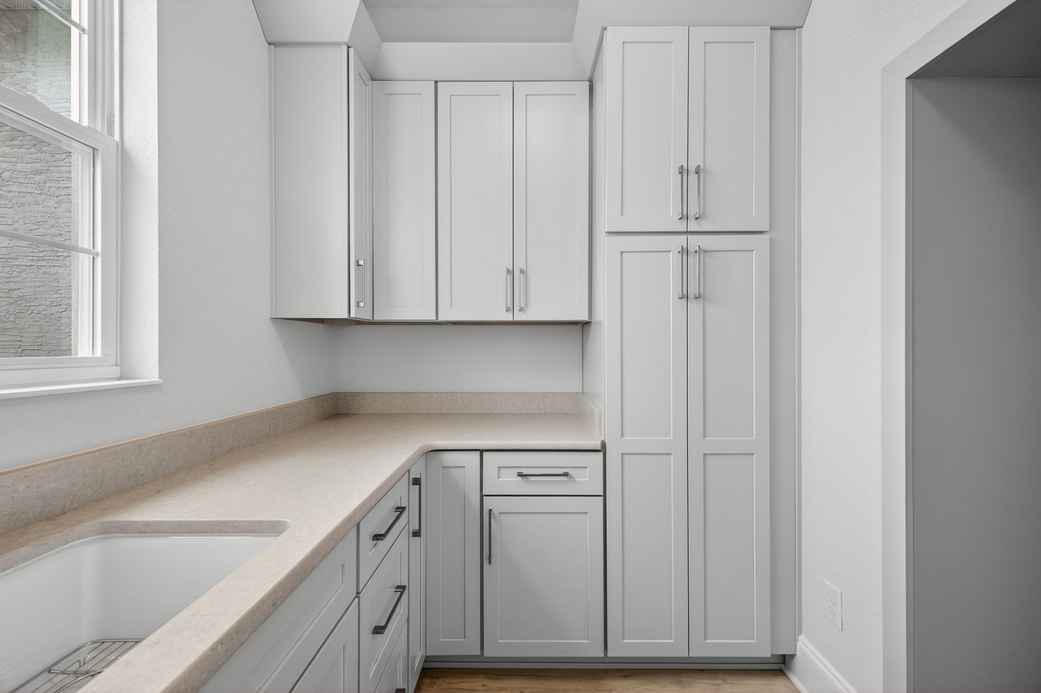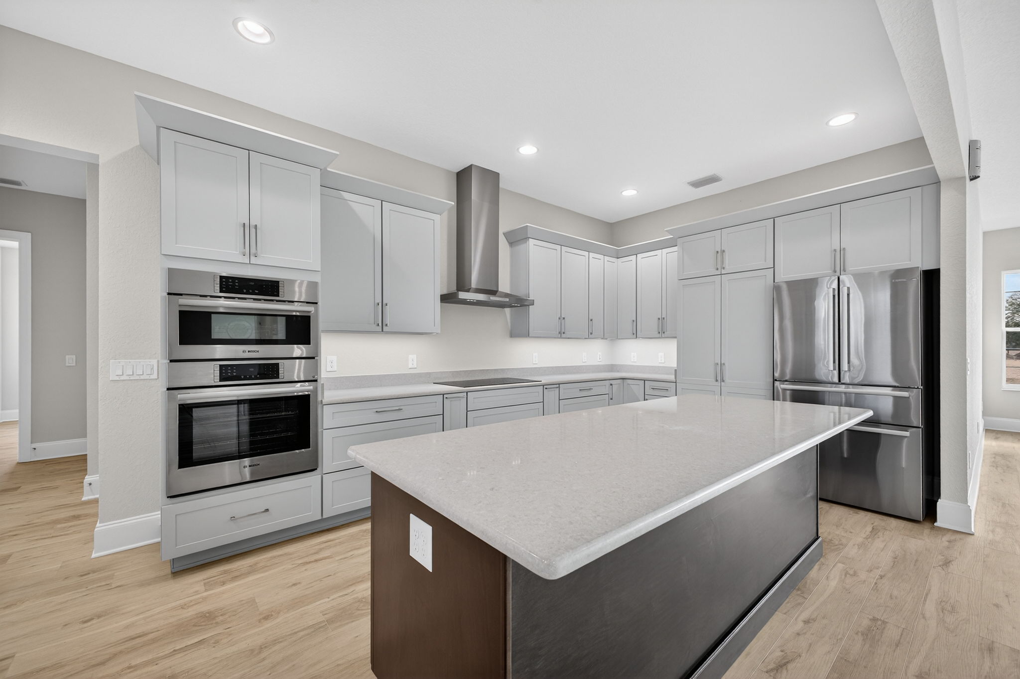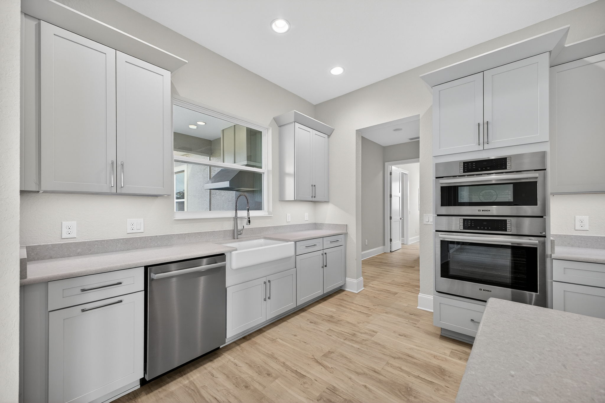 Through double entry doors, step into a grand open living and dining area that flows seamlessly into the stunning gourmet kitchen, complete with upgraded cabinetry, a Bosch appliance package, and a dedicated butler’s pantry featuring wraparound counters, additional cabinetry, and a prep sink—perfect for entertaining with ease.