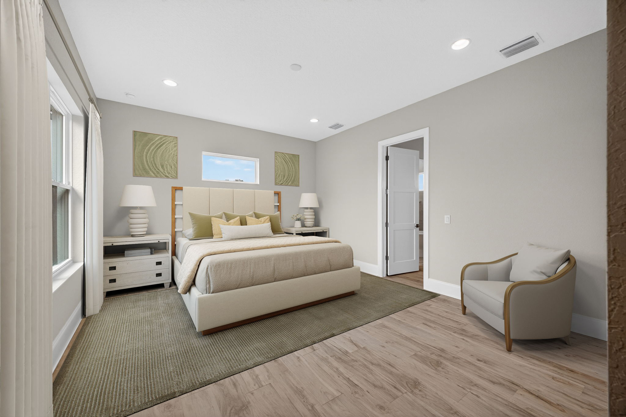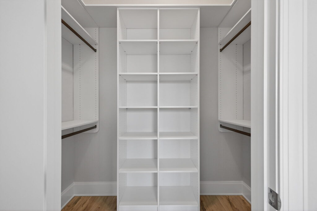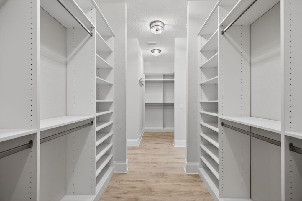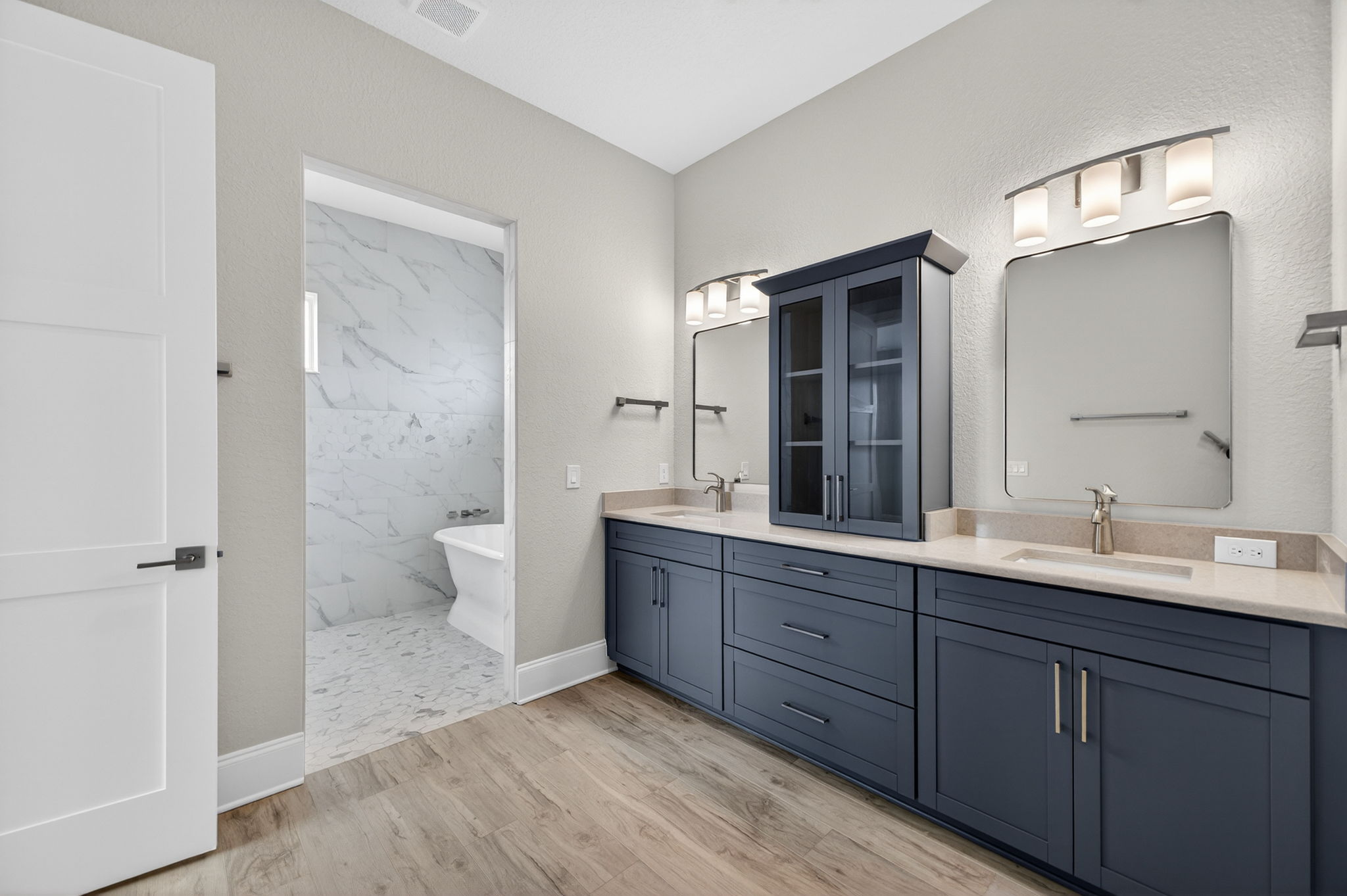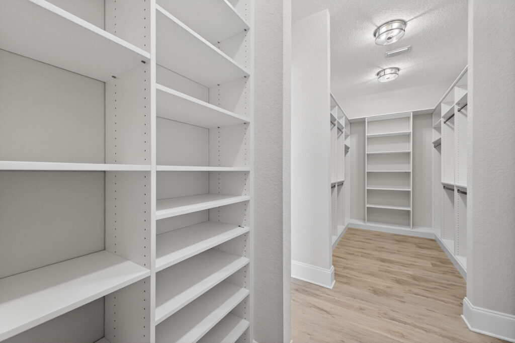 The primary wing offers a true retreat, with a spacious bedroom, dual walk-in closets with custom built in shelving, and a spa-inspired bath showcasing a luxurious wet room tub-in-shower design. The guest wing includes three additional bedrooms—each with its own custom walk-in closet—one with a private en suite, and another full bath conveniently located off the foyer. With luxury vinyl plank flooring throughout and a spacious three-car garage, the Newcastle delivers unmatched comfort with high-end finishes throughout.