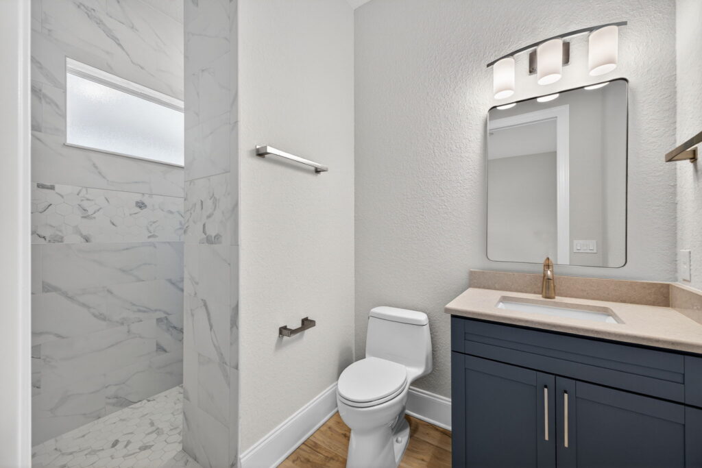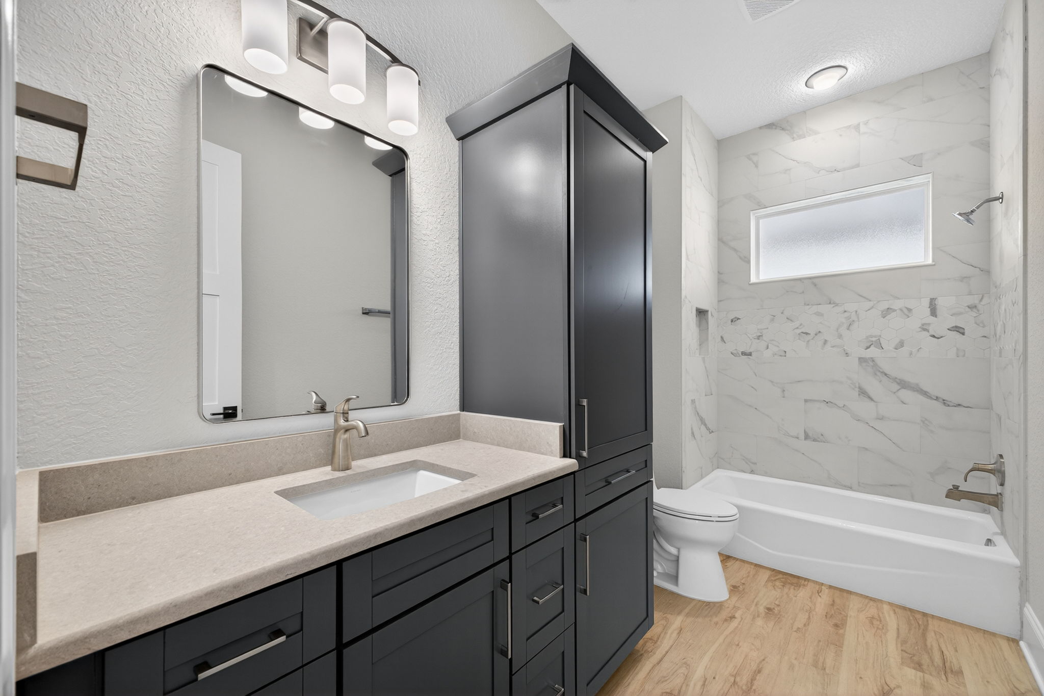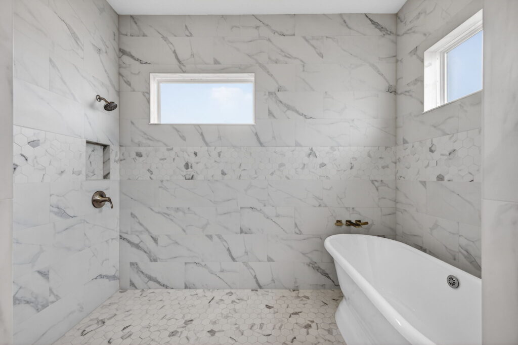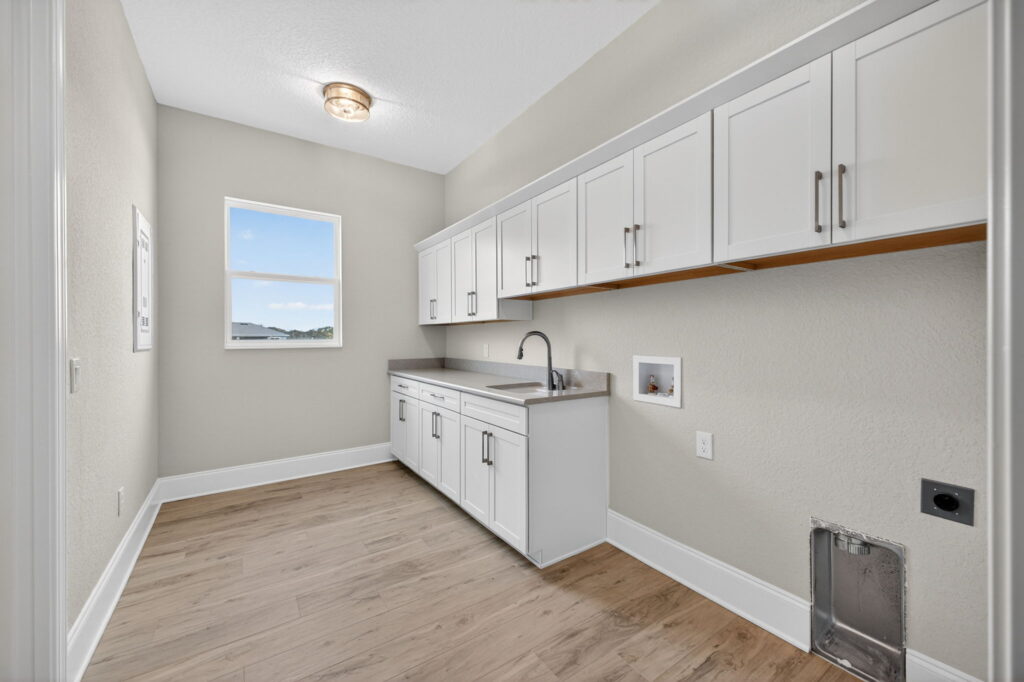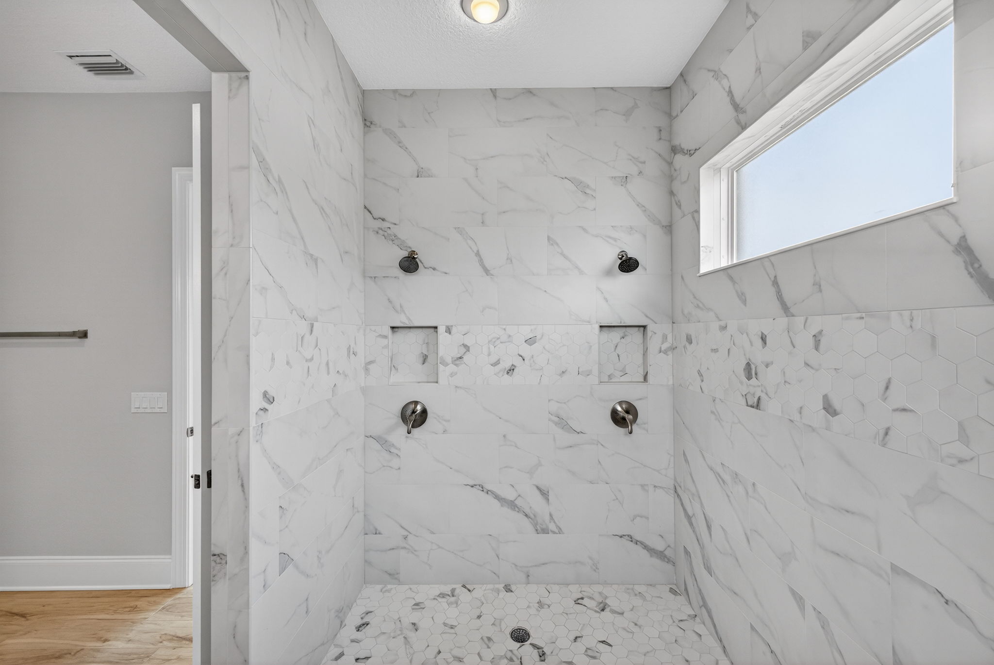 The primary wing offers a true retreat, with a spacious bedroom, dual walk-in closets with custom built in shelving, and a spa-inspired bath showcasing a luxurious wet room tub-in-shower design. The guest wing includes three additional bedrooms—each with its own custom walk-in closet—one with a private en suite, and another full bath conveniently located off the foyer. With luxury vinyl plank flooring throughout and a spacious three-car garage, the Newcastle delivers unmatched comfort with high-end finishes throughout.